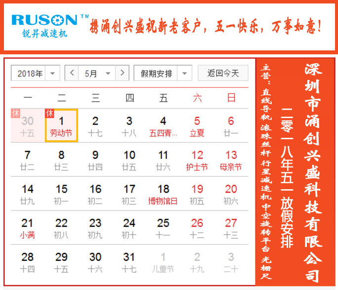 一、放假時間為2018年4月29日至2018年5月1日,共3天,于2018年5月2日正式上班。上班后,我公司的產(chǎn)品(直線導(dǎo)軌、滾珠絲桿、行星減速機、中空平臺、光柵尺)將正常供貨!