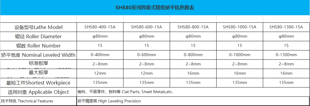 SHS80系列四重式高精密矯平機是通過整平機多組滾筒滾壓式矯平,從而達到平整效果。四/六重式高精密整平機采用上、下排矯平工作輥與支撐軸承(輪)之間加裝支撐輥,構(gòu)成上下各二/三重共四/六重的組輥結(jié)構(gòu);矯平輥受力分布均勻,結(jié)構(gòu)剛性好,工作輥撓曲變形小,矯平精度高,行程諧波衰減性矯直,從根本上解決普通矯平常見的矯不平、易產(chǎn)生輥印壓痕、工件塌角、鐮刀彎等問題,提高板材的矯正精度,適用范圍廣,材料表面不會留下輥壓痕跡,矯正精度高。