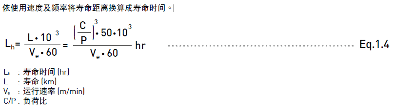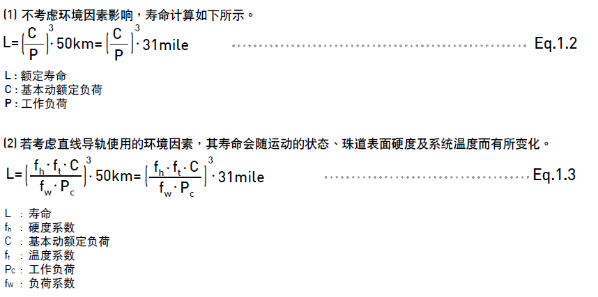 直線導(dǎo)軌的壽命會因?qū)嶋H承受工作負荷而不同,可依選用之直線導(dǎo)軌的基本動額定負荷及工作負荷推算出使用壽命。