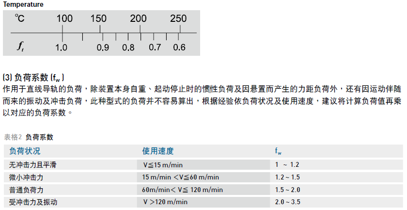 系統(tǒng)溫度會對直線導(dǎo)軌的材質(zhì)有影響,當(dāng)溫度高于100oC時直線導(dǎo)軌的額定負荷及使用壽命將會降低,此時動、靜額定負荷為尺寸表列值再乘以對應(yīng)的溫度系數(shù)。由于有些配件是塑料材質(zhì)較不耐高溫,故建議使用溫度應(yīng)低于100oC。