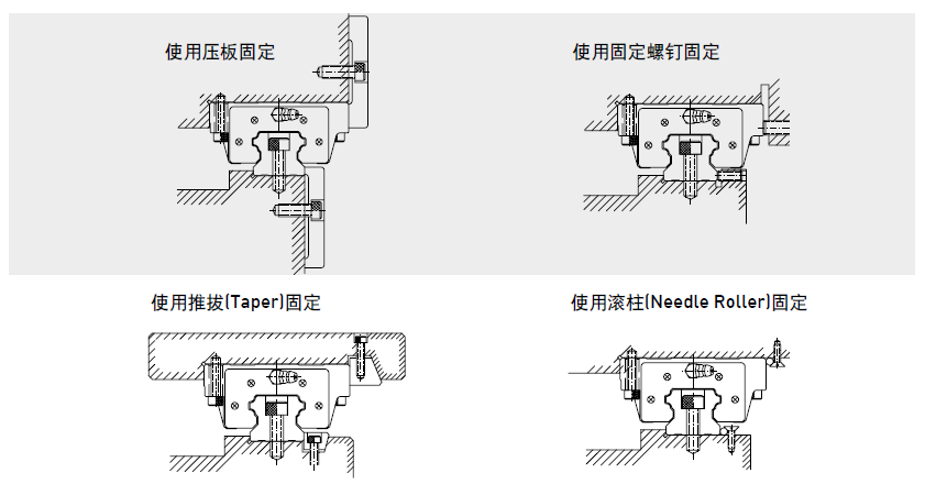 當(dāng)床臺(tái)受到振動(dòng)、沖擊力的作用時(shí),導(dǎo)軌及滑塊很可能偏離原來的固定位置,而影響精度。為避免發(fā)生類似的狀況,建議使用下圖所列的四種固定方式固定導(dǎo)軌及滑塊,以確保機(jī)臺(tái)的運(yùn)行精度。