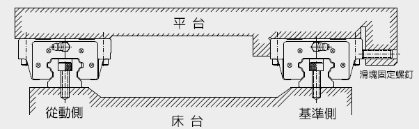 在無(wú)側(cè)向定位裝配面的安裝例中為確保從動(dòng)側(cè)導(dǎo)軌與基準(zhǔn)側(cè)導(dǎo)軌間的平行度,導(dǎo)軌可依下列所示安裝,而滑塊的安裝則與前述范例相同。