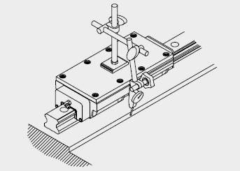 使用兩個(gè)滑塊緊密接合固定于測(cè)定用平板,依床臺(tái)導(dǎo)軌裝配附近的基準(zhǔn)面為準(zhǔn),使用千分量表校準(zhǔn)基準(zhǔn)側(cè)導(dǎo)軌之側(cè)邊基準(zhǔn)面,從導(dǎo)軌的一端開(kāi)始校準(zhǔn)并依序以特定的扭力鎖緊裝配螺絲。