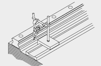 依直線塊規(guī),使用千分量表校準(zhǔn)基準(zhǔn)側(cè)導(dǎo)軌之側(cè)邊基準(zhǔn)面,從導(dǎo)軌的一端開(kāi)始校準(zhǔn)并依序以特定的扭力鎖緊裝配螺絲。