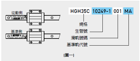 2. 確認(rèn)基準(zhǔn)軌與從動(dòng)軌:當(dāng)非互換型直線導(dǎo)軌配對(duì)使用時(shí),需注意基準(zhǔn)軌與從動(dòng)軌之差異?;鶞?zhǔn)軌側(cè)邊基準(zhǔn)面精度較從動(dòng)軌高,可作為床臺(tái)安裝承靠面?;鶞?zhǔn)軌上有刻上MA之記號(hào)。而且,雙軌配對(duì)使用時(shí),基準(zhǔn)軌編號(hào)為奇數(shù),而從動(dòng)軌之導(dǎo)軌編號(hào)為偶數(shù),安裝時(shí)請(qǐng)依照符號(hào)的指示,按順序進(jìn)行安裝(例如:001與002配對(duì)、003與004配對(duì)…),如圖一所示。如為多軌安裝,請(qǐng)以此類(lèi)推。