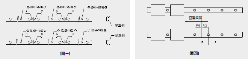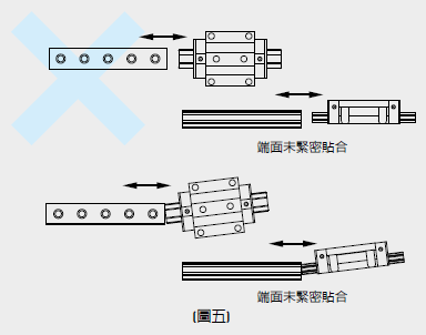 4. 導(dǎo)軌接牙件:導(dǎo)軌接牙安裝時(shí)必須依照導(dǎo)軌上標(biāo)示順序安裝,以確保直線導(dǎo)軌精度。接牙標(biāo)幟在接牙端的上表面,請(qǐng)將相同接牙標(biāo)幟的兩端接在一起,如圖三所示。且建議配對(duì)之導(dǎo)軌接牙位置最好能錯(cuò)開(kāi),以避免床臺(tái)至接牙處因不同導(dǎo)軌差異而造成精度不良,如圖四所示。