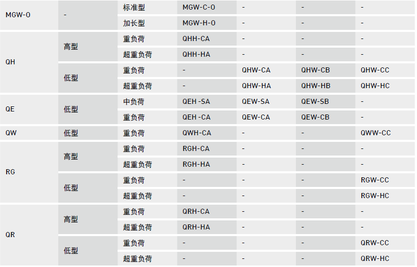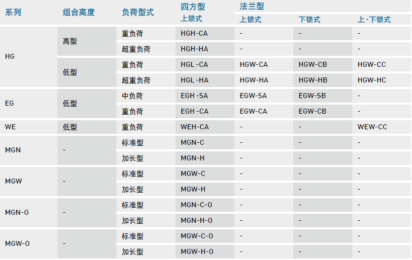 為服務(wù)客戶因應(yīng)其對產(chǎn)品多樣性的需求,除了適用一般工具機產(chǎn)業(yè)的HG系列外,更研究開發(fā)出較適合自動化產(chǎn)業(yè)的EG系列以及適合于單軸設(shè)備使用的WE/QW系列;且研究開發(fā)出適合高剛性需求產(chǎn)業(yè)的RG/QR系列及微小型機械半導體產(chǎn)業(yè)適用之MGN/MGW系列;并針對高科技產(chǎn)業(yè)研究開發(fā)出具有高速、寧靜、低發(fā)塵需求的QH/QE系列產(chǎn)品。