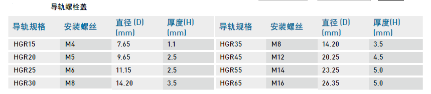 為防止切削粉末或異物經(jīng)由螺栓孔侵入滑塊內(nèi)部影響精度,客戶必須在安裝導(dǎo)軌時(shí)將螺栓蓋打入螺栓孔內(nèi),每支導(dǎo)軌出廠時(shí)皆配有螺栓蓋。