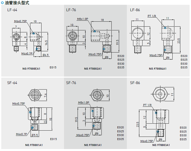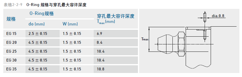 依客戶需要在滑塊前端或后端裝上油嘴以供手動(dòng)打油,EG系列特別在端蓋側(cè)邊預(yù)留側(cè)油孔位置安裝油嘴(一般為直油嘴),提供側(cè)向打油,側(cè)向打油的位置建議在非側(cè)基準(zhǔn)邊,但若有特殊需要亦可放在側(cè)基準(zhǔn)邊??蛻羧缬猩鲜鰝?cè)向打油需求請(qǐng)與我們聯(lián)絡(luò)。EG系列在端蓋頂端亦預(yù)留上油孔位置,客戶若欲從端蓋上方供油,須使用直徑0.8mm的金屬針以預(yù)熱的方式,在指定位置將上油孔穿通,再將密封環(huán)安裝于凹處即可,避免使用鉆頭穿通上油孔,碎屑有污染油道的危險(xiǎn)。使用接管方式自動(dòng)供潤(rùn)滑油脂之直線導(dǎo)軌,則可依連接管型式選用安裝油管接頭。