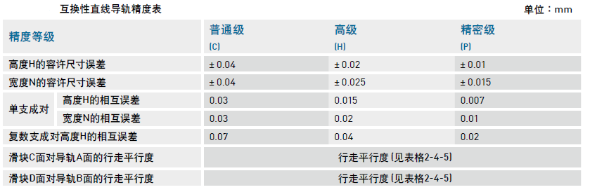 互換性直線導(dǎo)軌精度在滑塊組裝于單支導(dǎo)軌之成對(duì)高及寬度精度,同非互換性直線導(dǎo)軌精度,但若組裝于不同支導(dǎo)軌上,因?qū)к壐叨日`差,其成對(duì)高及寬度精度,比非互換性直線導(dǎo)軌精度稍微遜色,而行走平行度精度則同非互換性直線導(dǎo)軌之精度。