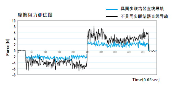 傳統(tǒng)不具同步聯(lián)結(jié)器之直線導(dǎo)軌開始運(yùn)行時(shí),負(fù)荷側(cè)的鋼珠會(huì)先運(yùn)動(dòng),再推擠方向回轉(zhuǎn)部與無負(fù)荷側(cè)內(nèi)的鋼珠,造成連鎖的來回碰撞,使得摩擦阻力變動(dòng)起伏劇烈。而采用SynchMotionTM技術(shù)的QH系列直線導(dǎo)軌由于具有同步聯(lián)結(jié)器,將同一循環(huán)內(nèi)的所有鋼珠串聯(lián)在一起,所以當(dāng)滑塊開始運(yùn)動(dòng)時(shí),所有鋼珠幾乎同時(shí)啟動(dòng),且鋼珠間并無來回的碰撞,在保持一定的運(yùn)動(dòng)慣性下,摩擦阻力的變動(dòng)幅度能有效的減少。