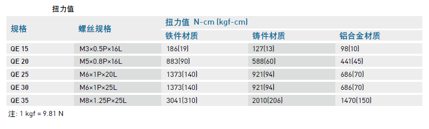 導(dǎo)軌裝配螺絲之扭力值安裝導(dǎo)軌時是否鎖緊貼平基準(zhǔn)面影響直線導(dǎo)軌精度甚劇,因此為達(dá)到每顆螺絲都能鎖緊的目的,建議使用下列扭力值鎖裝配螺絲。