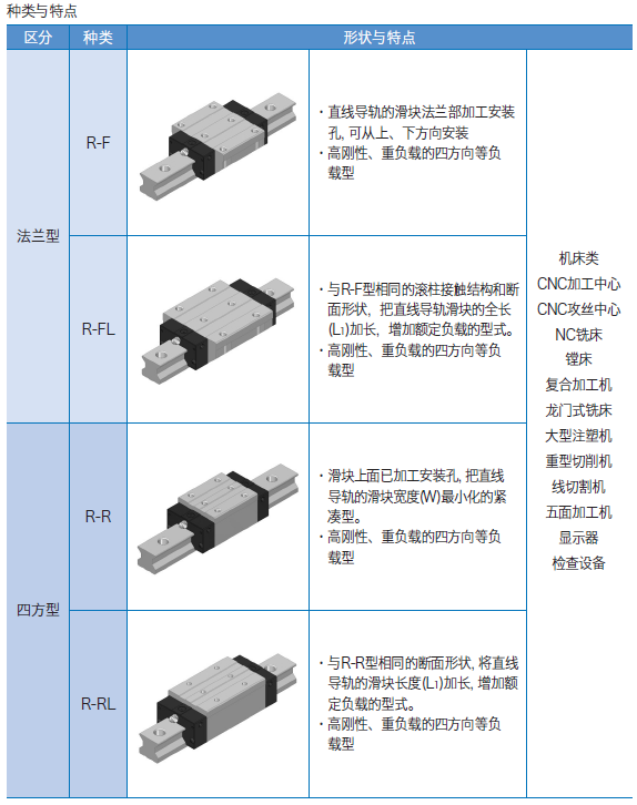 f. 與相同尺寸的鋼球型直線導(dǎo)軌相比, 具有更大的基本額定負(fù)載, 有利于設(shè)備的小型化, 使用相同尺寸也能獲得更長的使用壽命。